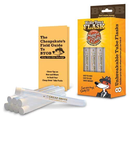 Included is the box is the must-have “Cheapskates Field Guide to BYOB” that gives you quick tips and tricks on how to sneak alcohol on a cruise, into a concert, amusement park or sporting event. Now you can DRINK ANYTHING, ANYTIME, ANYWHERE.